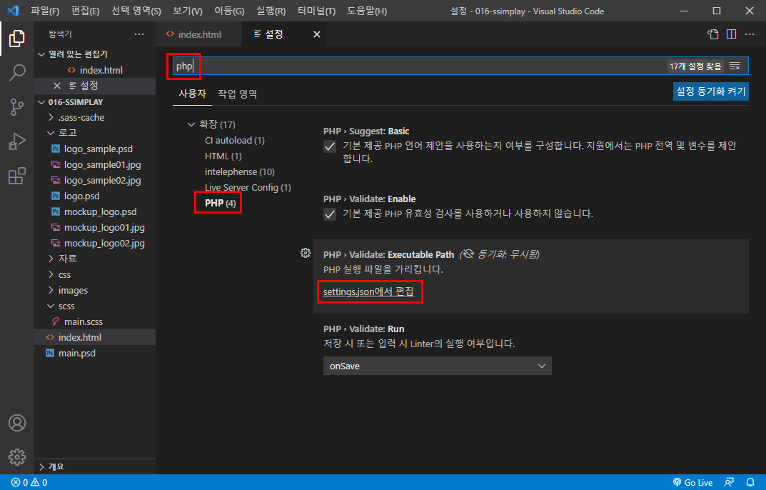 - 그러면 확장 아래 PHP탭>settings.json에서 편집