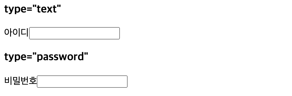 회원가입 혹은 로그인 기능에 필수인 필드입니다. 특별하게 type="password"는 입력의 결과물을 마스킹해서보여줍니다. 따라서 겉으로 볼 때에는 ***으로 보이지만 실제 input 필드의 값은 입력한 값이 됩니다.