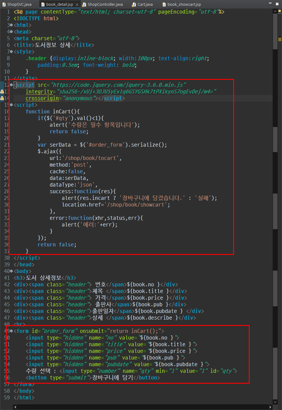svc.toCart 메소드에 book 객체를 전달해 boolean 값을 전달받는다