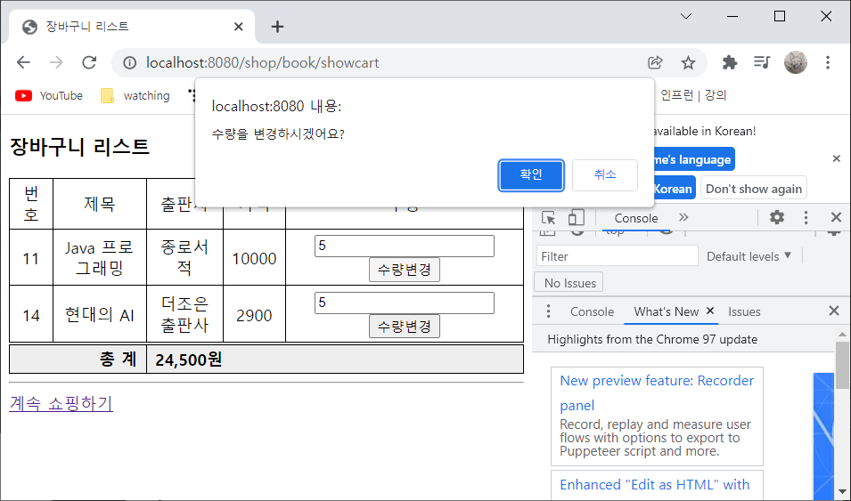 수량변경을 선택하면 페이지 이동 없이 한 페이지 안에서 변경이 완료됨
