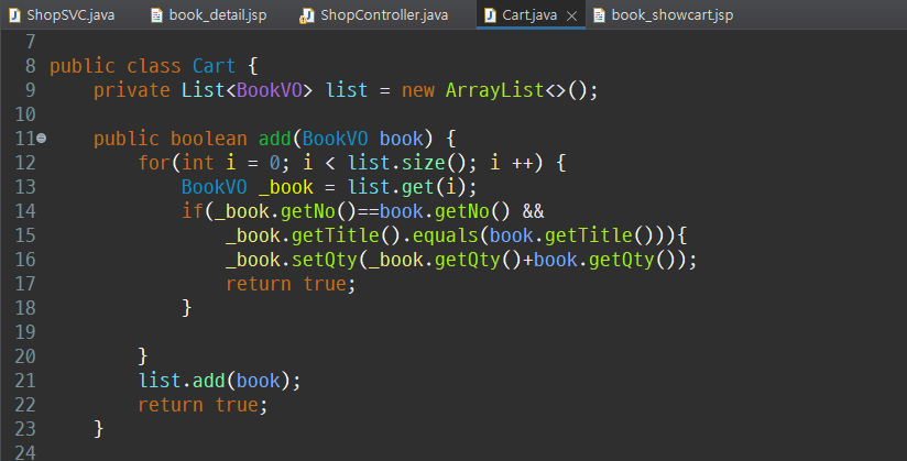 null 이 아니면 session으로 넘어온 값을 Cart 객체로 받아 cart 내장 메소드 add에 book객체를 넣어 그 결과를 반환한다