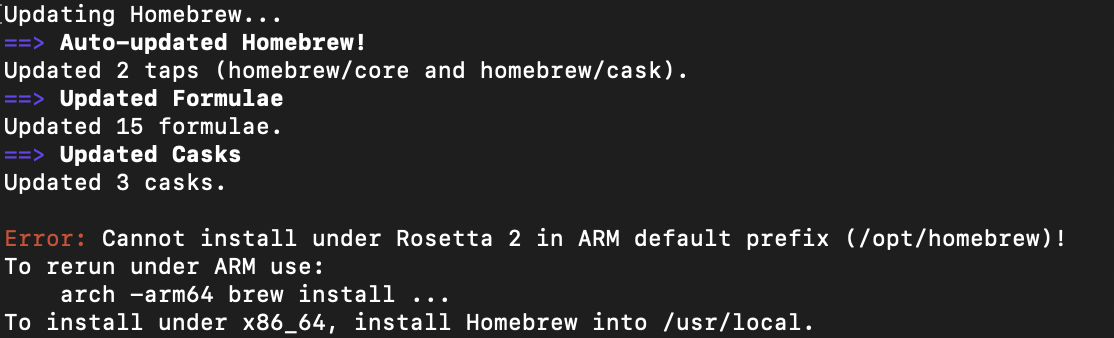 복잡한 설정을 볼 필요 없이 하단 문구를 잘 읽어보면 "arch -arm64 brew install ..." 명령어를 사용하여, ARM 아키텍처 버전으로 설치하게끔 유도하고 있으므로, 다음 명령어로 다시 설치를 시도해보자.