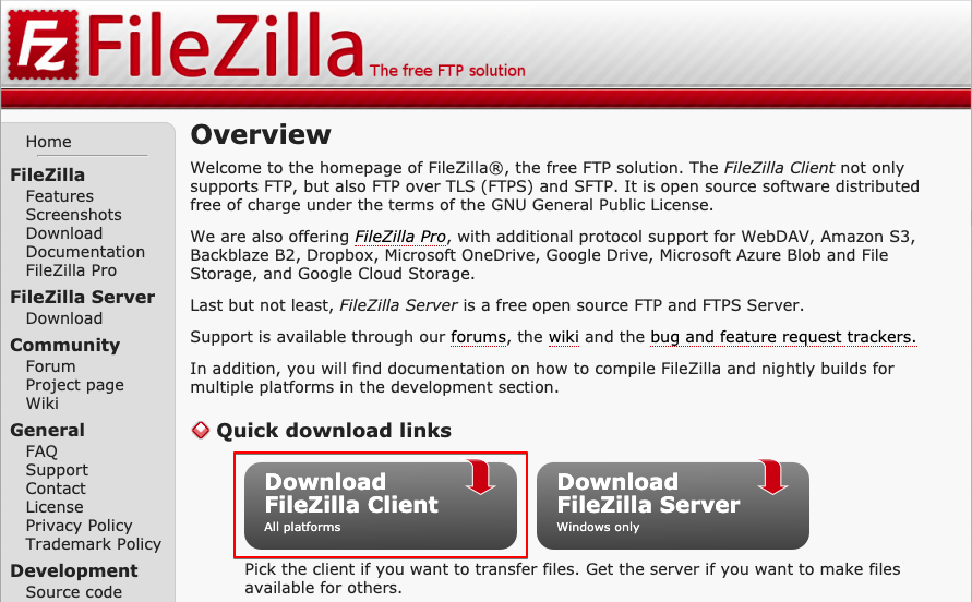 - 다운로드 방법 : 웹사이트 접속 후 아래 그림과 같이 "Download Filezilla Client" 다운로드 버튼 클릭 후 이동 합니다.