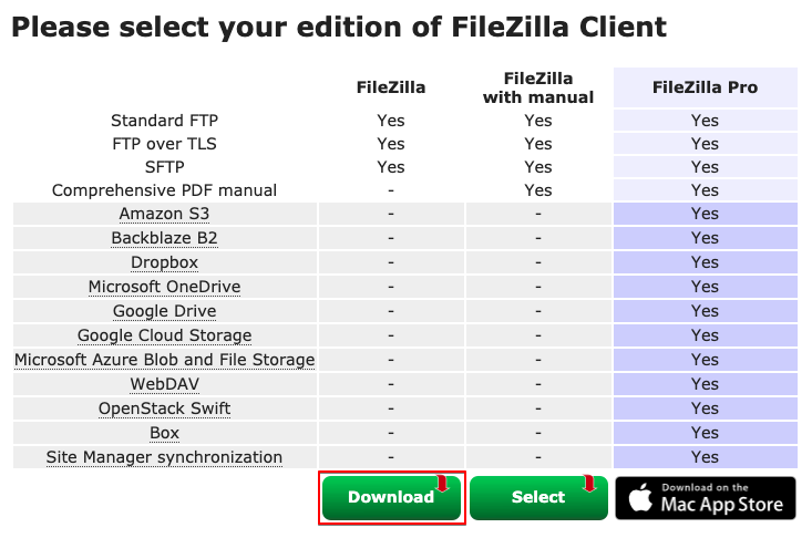 - 다양한 파일질라 설치 파일이 있고, 이중 무료 버전인 "FileZilla" 다운로드를 클릭 합니다.
