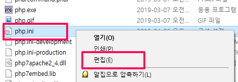 그럴때는 php가 설치되어 있는 경로에 php.ini 파일을 편집하기로 열어준다.